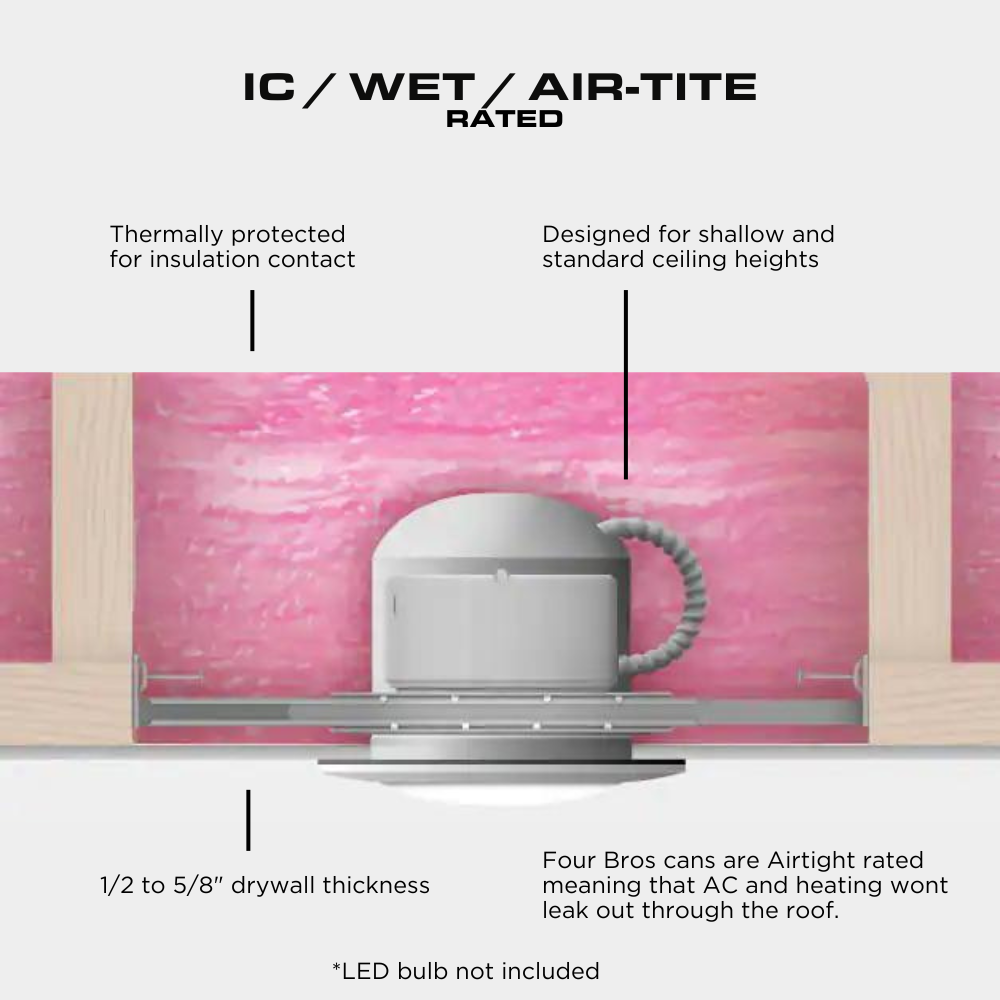 Four Bros Contractor's Pack NC4/LED 4 inch LED recessed housings are specially designed for quick and easy installation during new construction projects. The low can height allows for installation in tight ceilings with 2 in. x 6 in. joist construction. Each pot light comes with a dedicated LED push-in connector system that provides high efficacy code compliance when used with qualified LED trims equipped with same connector. The airtight design helps reduce heating and cooling costs by minimizing air flow through the ceiling. These recessed cans include adjustable hanger bars, are IC rated and pre-wired for easy installation.