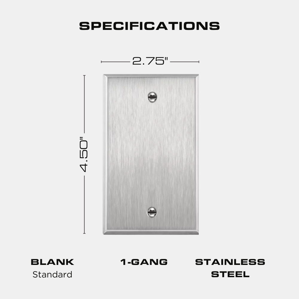 Enerlites 7701 1-gang blank wall plate is used to cover single gang electrical boxes in residential and commercial settings. This durable stainless steel faceplate can withstand corrosion and is usually installed in high traffic areas.